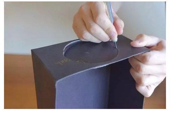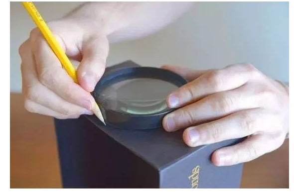 然后將放大鏡的手柄卸下來,只留下鏡片部分。在鞋盒的側(cè)面,用鉛筆圍著放大鏡畫一個圓