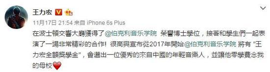11月17日晚,王力宏表示自己在母校伯克利音樂(lè)學(xué)院獲得了博士學(xué)位,自己的母校之后還將設(shè)立“王力宏全額獎(jiǎng)學(xué)金”,用來(lái)獎(jiǎng)勵(lì)來(lái)自中國(guó)的年輕音樂(lè)人。圖片中王力宏身著博士服,站在演講臺(tái)上與臺(tái)下的同學(xué)們親切交流,隨后還進(jìn)行了精彩的表演。